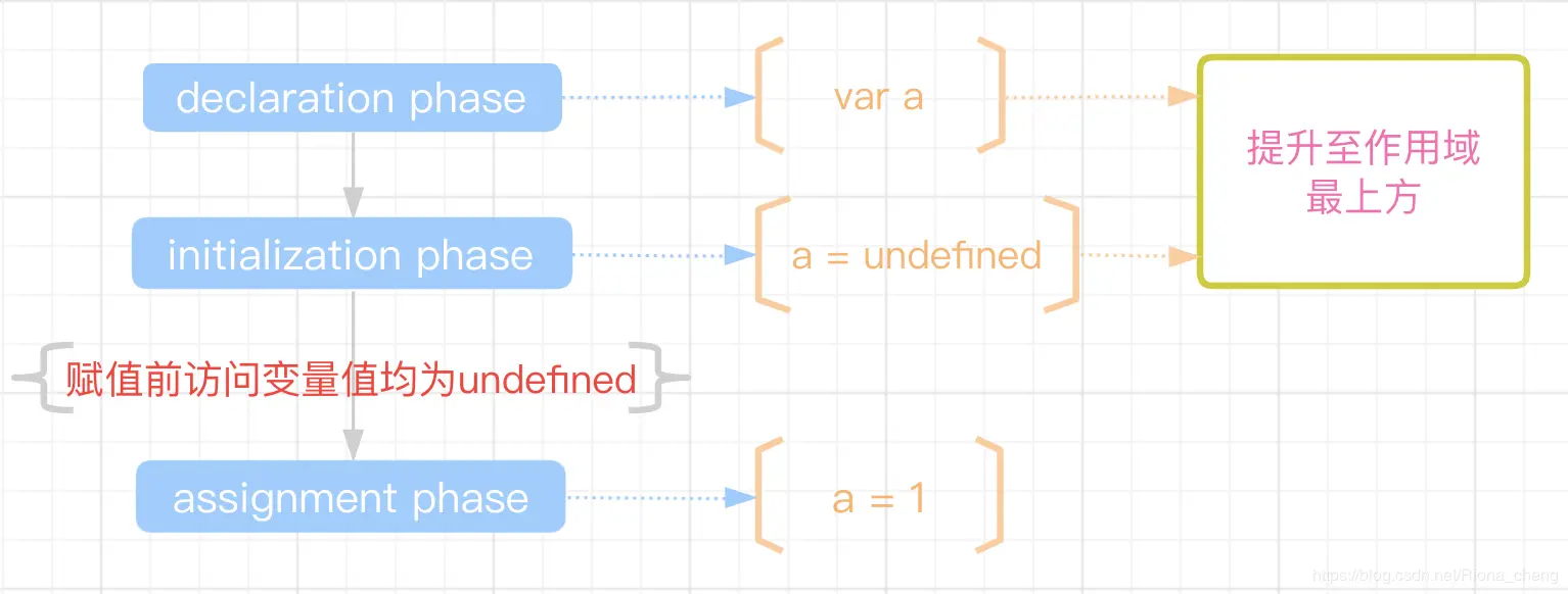 以函数作用域为例,在函数作用域中遇到 var a = 1 这段代码,编译器会首先查找当前作用域下是否已经声明过该变量,若已经存在,则直接忽略这次声明;若不存在,则在当前作用域中声明一个名字为 a 的变量,并进行初始化操作(变量 a 的值初始化为 undefined),这也是为什么使用 var 可以进行重复声明的原因. 这里的声明和初始化均被提升至作用域的最顶端.