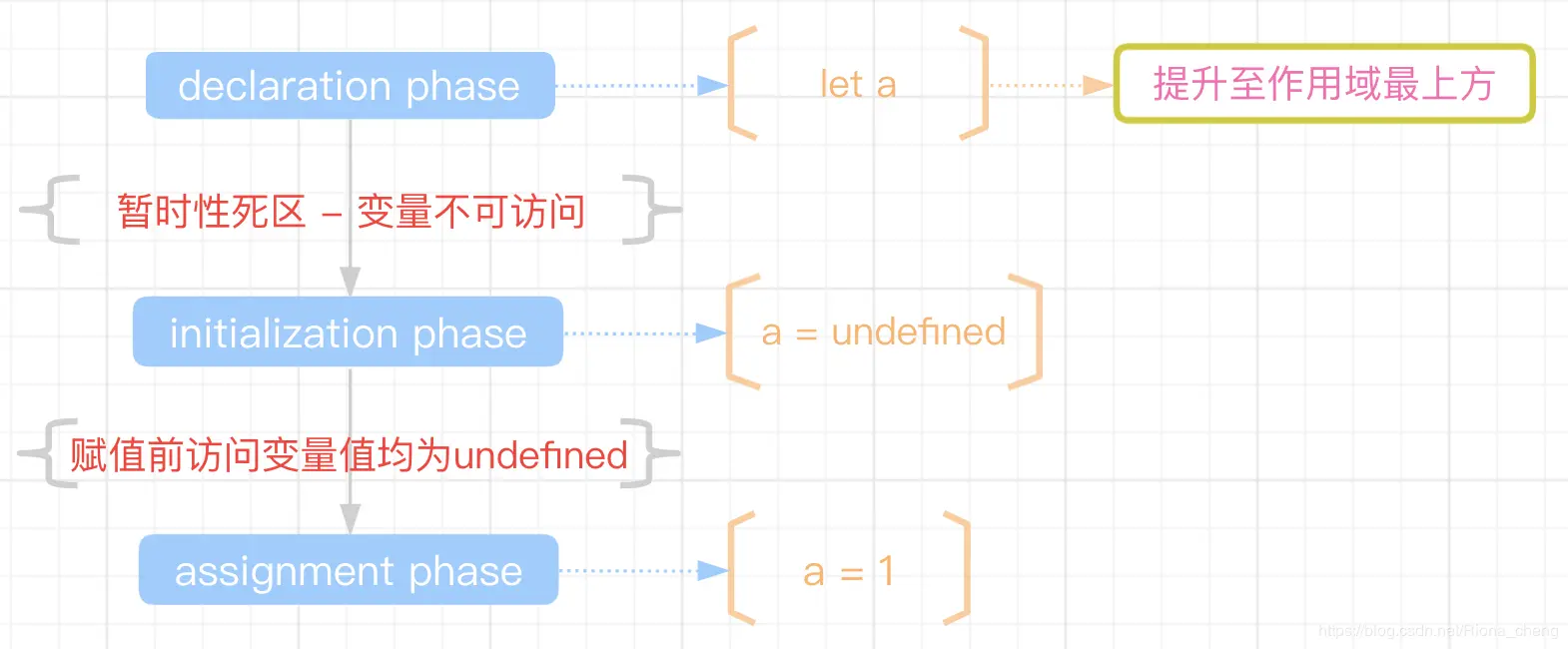 let 的生命周期与 var 的主要区别在于,声明和初始化阶段没有同时进行提升,只有声明阶段被提升至当前作用域的最上方,所以在声明和初始化阶段之间就出现了暂时性死区现象,此阶段不可访问该变量,否则会抛出异常.