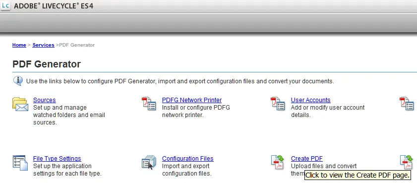 (5) Do some health check on server. Click home->services->LiveCycle PDF Generator ES4: Click “Create PDF”: