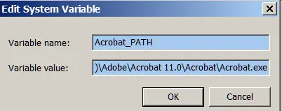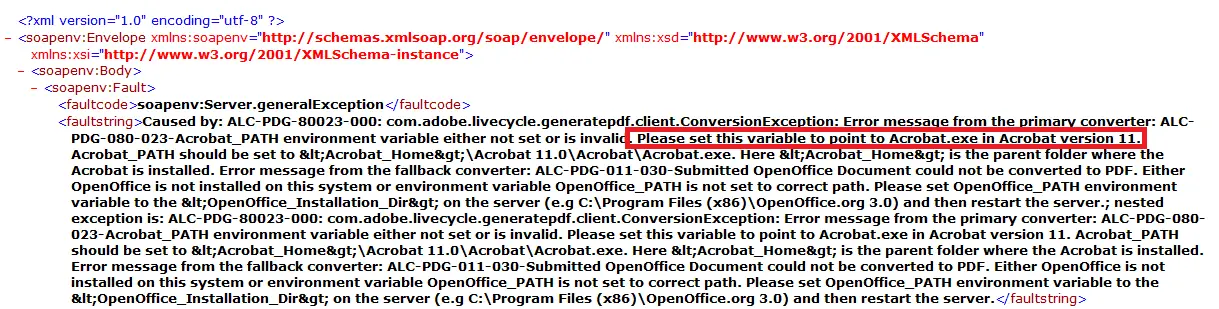 In fact the JBoss server uses Adobe Acrobat XI Pro to convert the document into PDF format. The error message prompts you that either Acrobat XI Pro is not installed or there is something wrong with environment variable set up. Don’t mix Acrobat XI Pro with Acrobat Reader XI! Acrobat has far more powerful functionalities than the latter:
