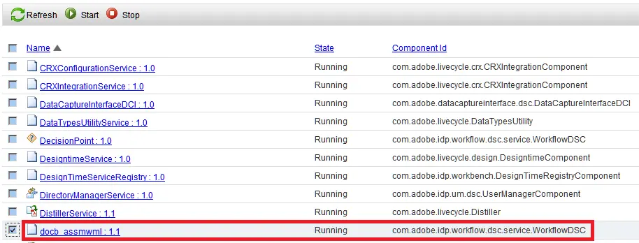 (6) Import the docb_assmwml.lca attached in the note. In admin console Home->Services->Applications and Services, ensure the status of docb_assemwml is running: