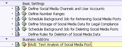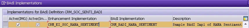 We have delivered a sample implementation which could calculate the sentiment of the text posted in twitter & facebook like “Positive, Negative, Strong Positive, Neutral”, with the help of SAP HANA Text Analysis Engine. Of course you could use your own TA engine within that BAdI enhancement implementation.
