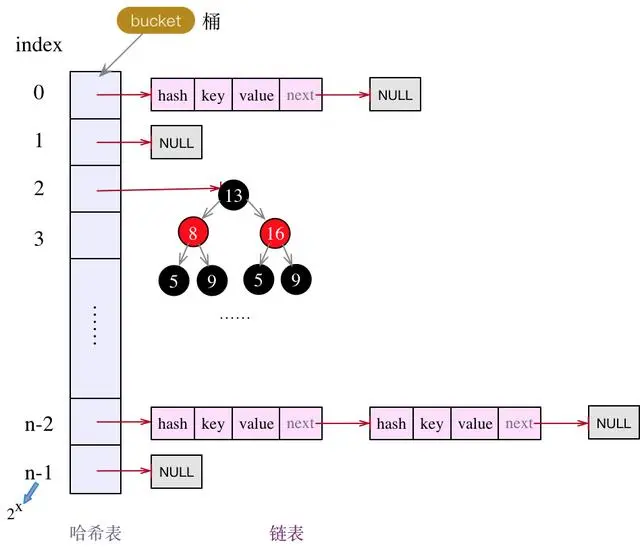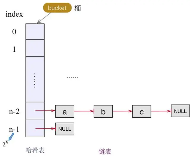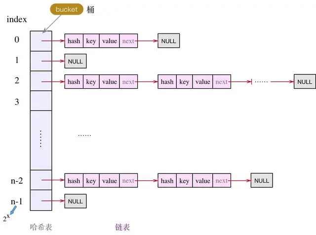 不管是 1.7,还是 1.8,HashMap 的实现框架都是哈希表 + 链表的组合方式。结构图如下:
