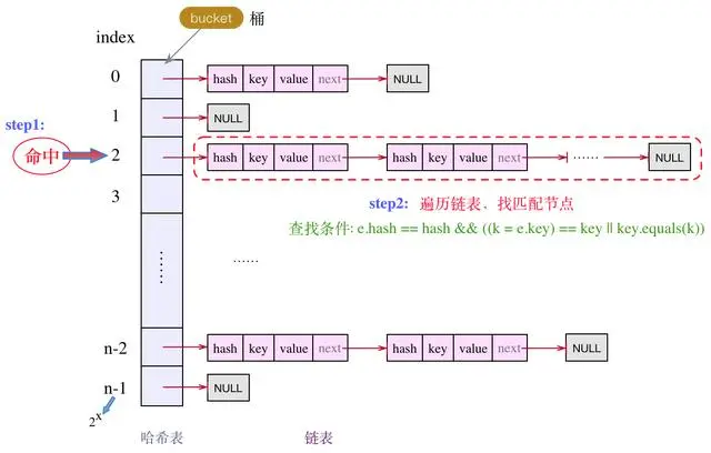 首先得有 key 的 hash 值,就是一个整数,int 类型,其计算方式使用了一种可尽量减少碰撞的算式(高位运算),具体原理不再展开,只要知道一点就行:使用 key 的 hashCode 作为算式的输入,得到了 hash 值。
