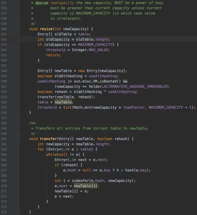 在进一步说明死循环的过程前,我们先看下 JDK7 中的扩容代码片段: