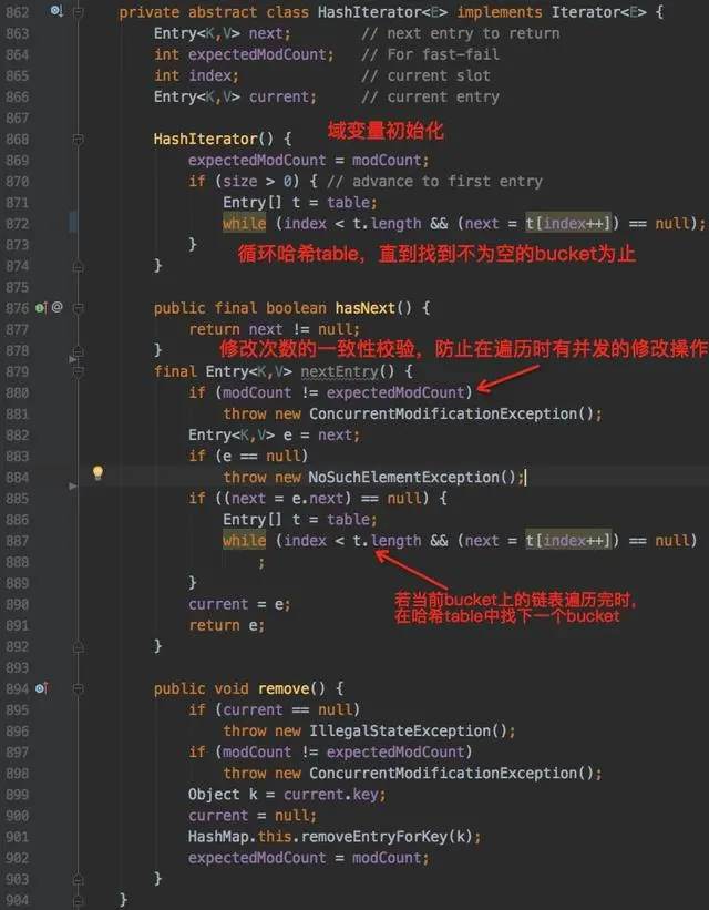 上图中,已对各个变量做了简单的解释。 再多说一下,最后一个变量modCount,记录了 map 新增/删除 k-v 对,或者内部结构做了调整的次数,其主要作用,是对 Map 的iterator()操作做一致性校验,如果在 iterator 操作的过程中,map 的数值有修改,直接抛出ConcurrentModificationException异常。
