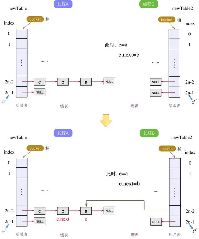 其实就是简单的链表反转,再进一步简化的话,分为当前结点e,以及下一个结点e.next。我们以链表a->b->c->null为例,两个线程 A 和 B,分别做扩容操作。