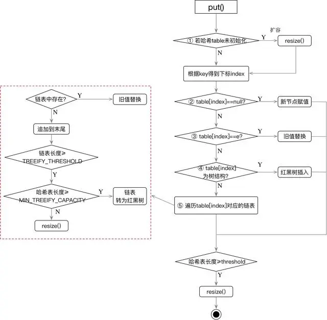 threshold = table.length * loadFactor;当执行put()操作放入一个新的值时,如果 map 中已经存在对应的 key,则作替换即可,若不存在,则会首先判断size>=threshold是否成立,这是决定哈希 table 是否扩容的重要因素。