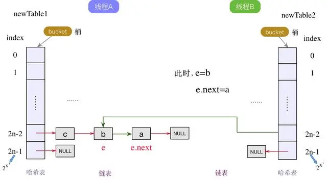 线程 A 和 B 各自新增了一个新的哈希 table,在线程 A 已做完扩容操作后,线程 B 才开始扩容。此时对于线程 B 来说,当前结点e指向 a 结点,下一个结点e.next仍然指向 b 结点(此时在线程 A 的链表中,已经是c->b->a的顺序)。按照头插法,哈希表的 bucket 指向 a 结点,此时 a 结点成为线程 B 中链表的头结点,如下图所示: