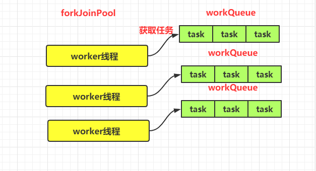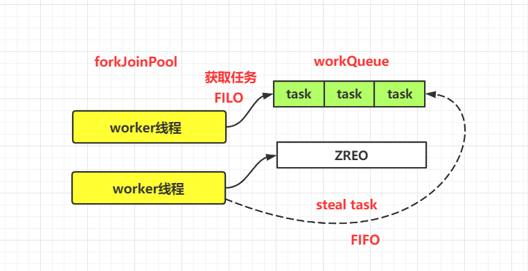 当线程执行完自己deque的任务,且其他线程deque还有多的任务,则会启动窃取策略,从其他线程deque队尾获取线程