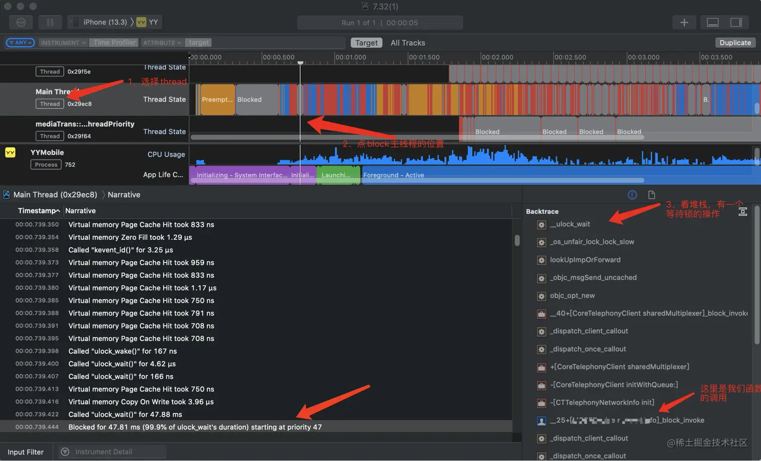 大概是上图的操作方式,得出主线程的所有任务耗时时间,每个任务根据图右侧的堆栈挨个排查是否是启动链路中可优化的(几毫秒的也别放过)。
