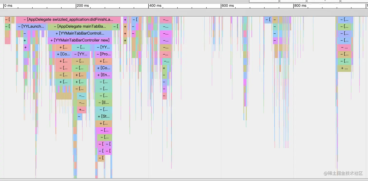 从左到右为启动时间轴,从上到下为:方法A里面调用了方法B、C、D。方法A就在最上层,BCD就在下一层,例如APPDelegate的swizzied_didFinishLuanch方法里面调用了YYlaunch...和MainTabbarController。以此类推可以找到最终调用到了哪个方法导致的耗时。