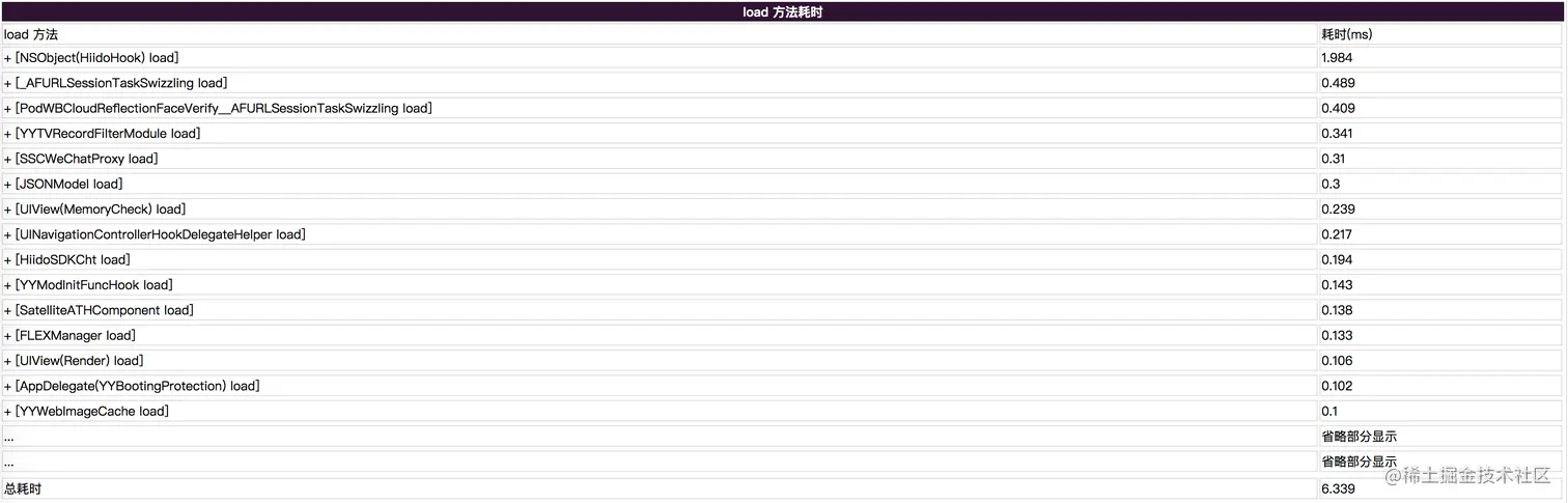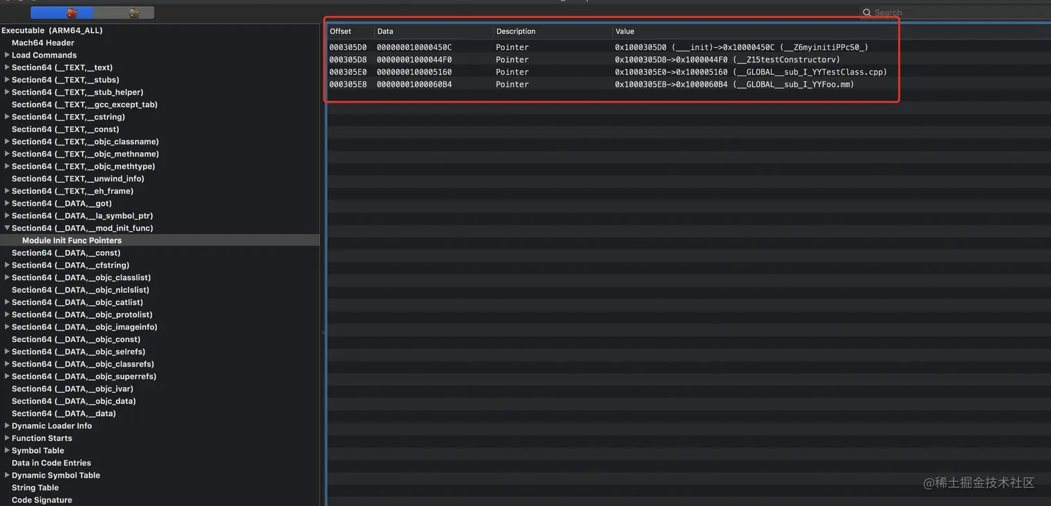是在 DATA 段,Pointer 指向的区域是 TEXT 段, 项目中的这类函数很多,这些函数会在 Pre-Main 阶段执行,但是基本都不耗时, 通过 getsectiondata(machHeader, "__DATA", "__mod_init_func", &size),读取函数指针,用 hook 函数指针替换原来的函数指针,把原来的函数地址记录在全局数组中,hook 函数从数组中根据 index 调用本该执行的函数