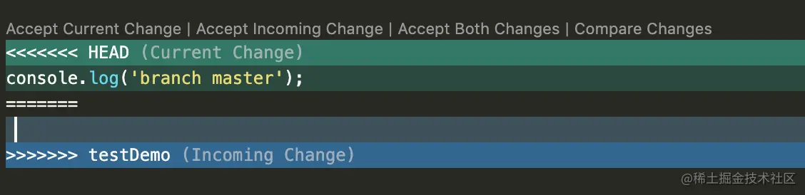 current Change代表当前分支下修改,incoming Change代表要合并的分支的修改。 我们可以通过选择accept来解决冲突,选择用哪个分支下的代码,也可以自己修改。