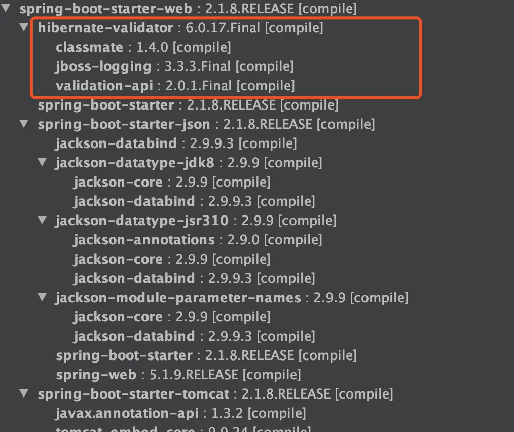 SpringBoot 项目的 spring-boot-starter-web 依赖中已经有 hibernate-validator 包,不需要引用相关依赖。如下图所示(通过 idea 插件—Maven Helper 生成):