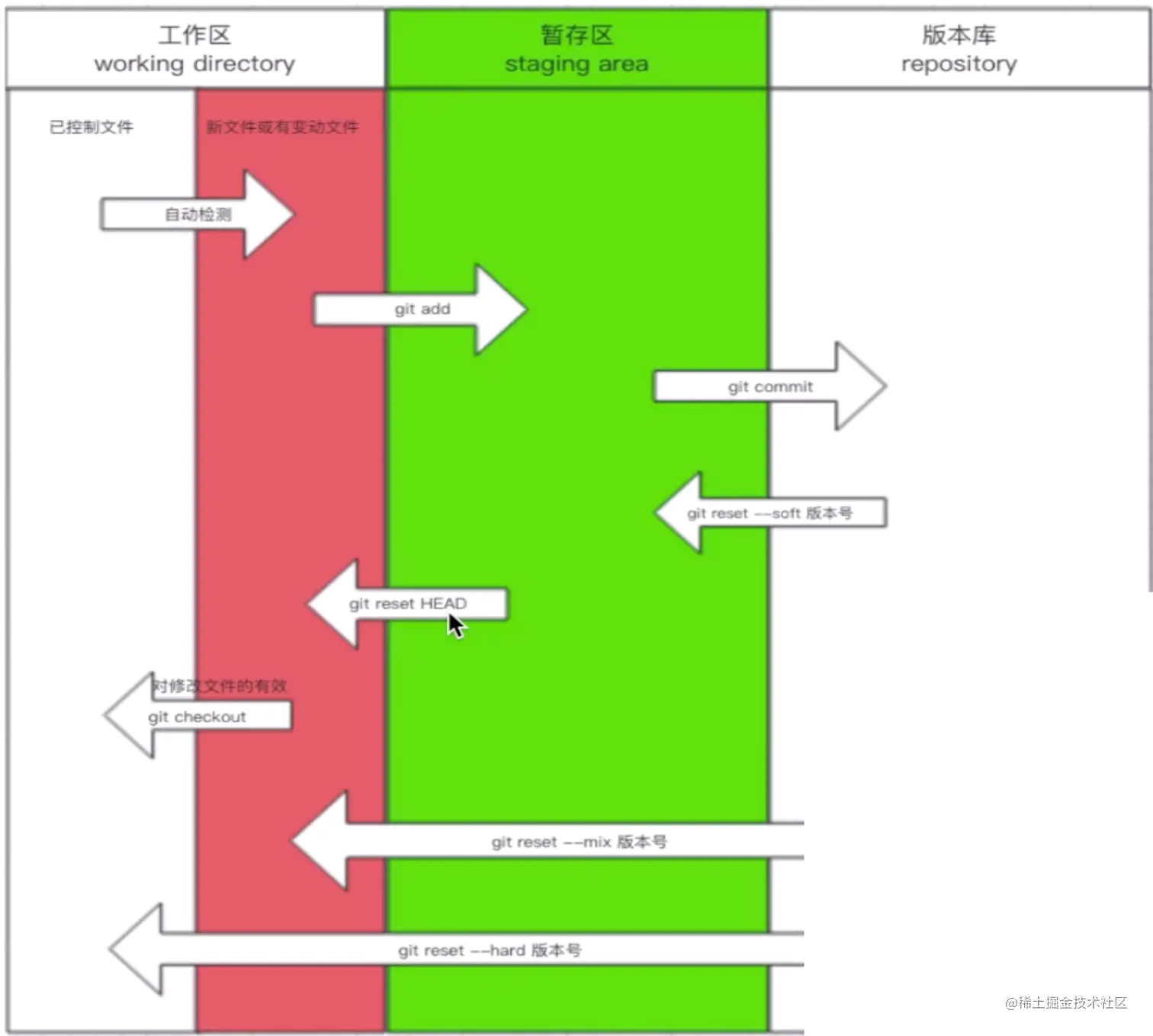 git commit -m "提交信息":将暂存区中的文件提交到版本库(提交后就有自己的提交版本号信息)