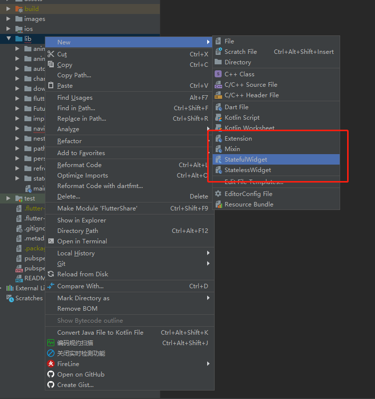 比如新建一个名字为 TestTemplate 使用 StatefulWidget 模板的文件,最终生成的文件里面自动生成的代码如下