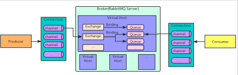 - 1:生产者与mq建立连接(TCP,类似于线程池)通过连接中的通道发送消息至mq的交换机(交换机不具备存储消息的功能),交换机将消息路由到对应的队列中.