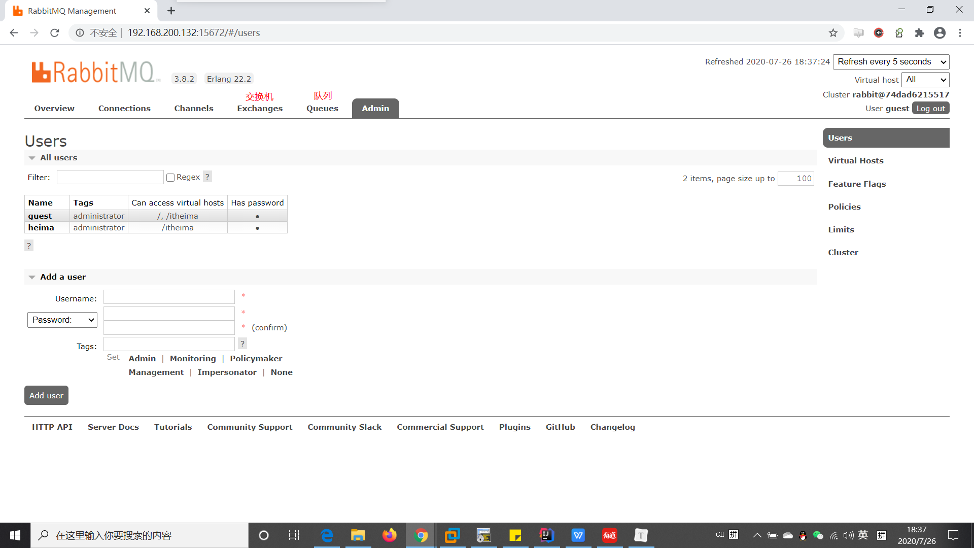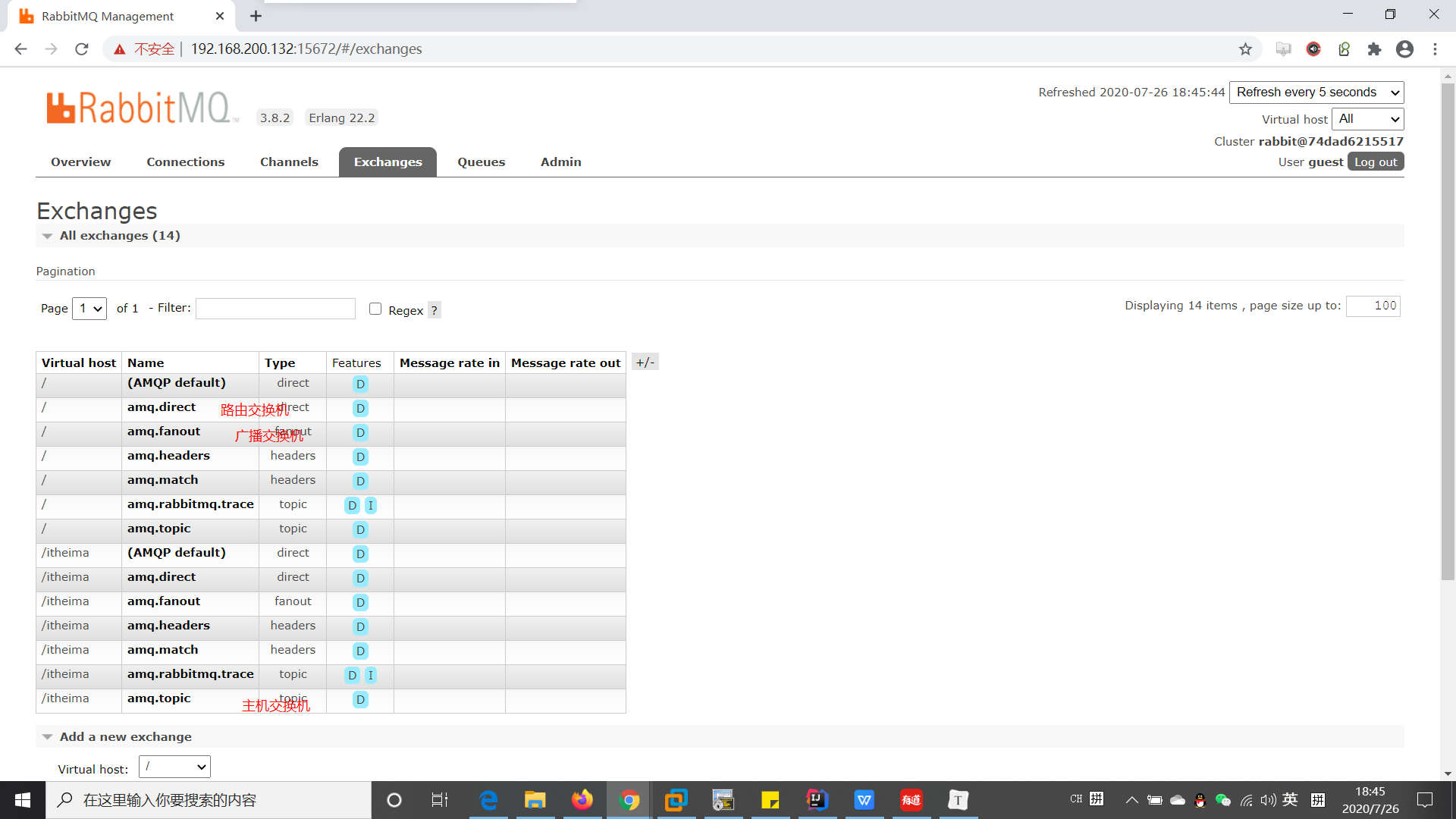 需要自己手动创建交换机,并绑定队列(可以绑定多个)