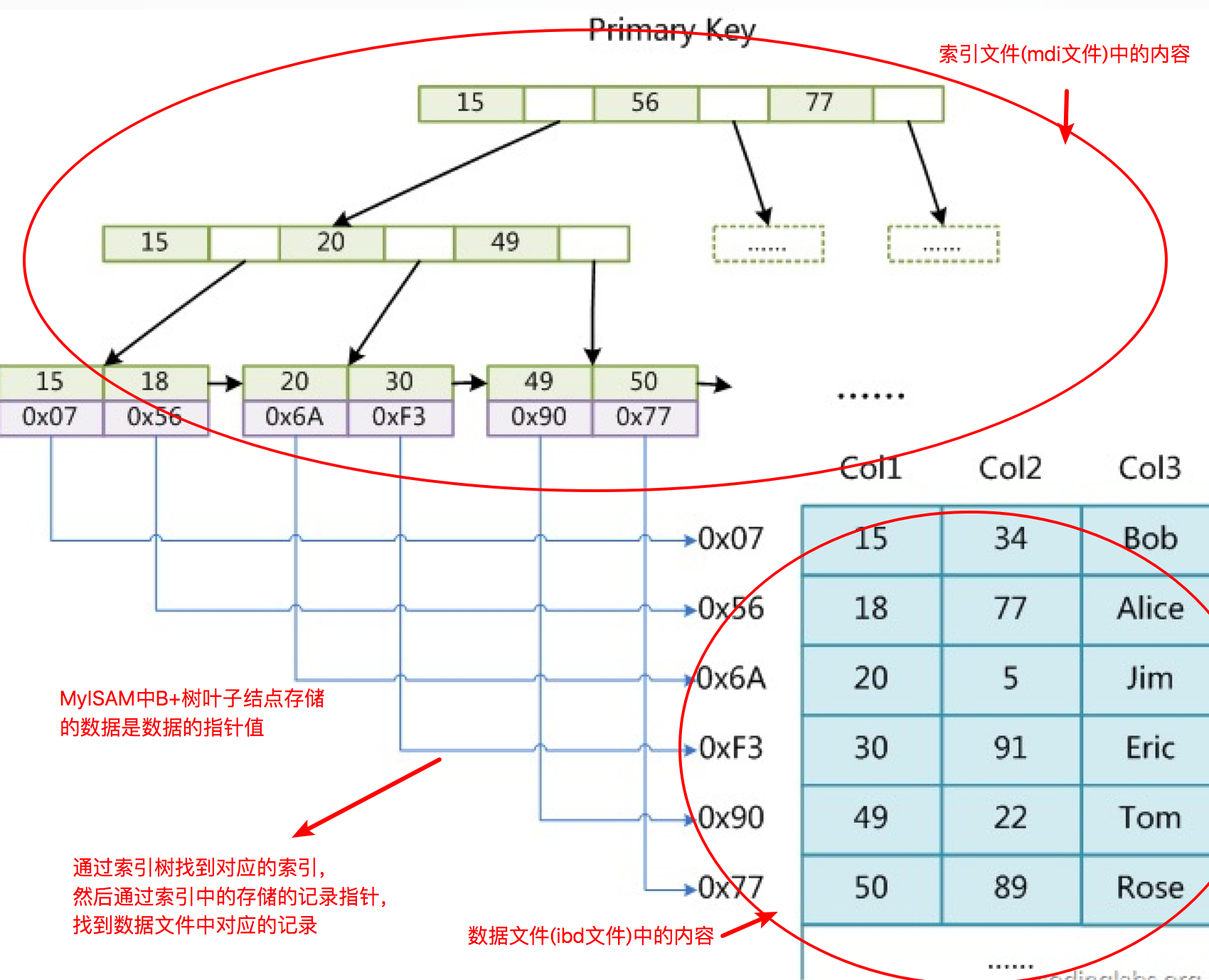 - 索引是存储在磁盘文件中的(可能单独的索引文件中,也可能和数据一起存储在数据文件中)