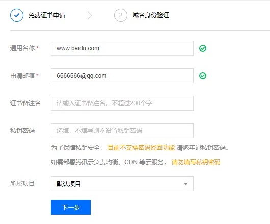 - 选择腾讯免费提供的 SSL 证书,值得注意的是这个免费仅支持绑定一个一级域名或子域名,有多个需求的选择其他类型。