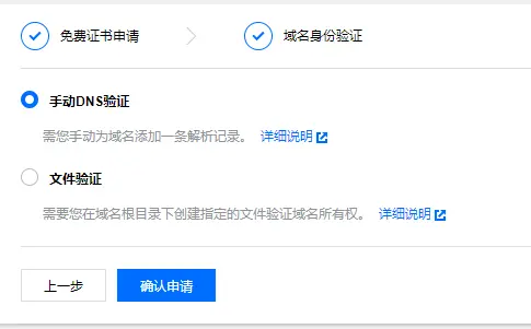 查看 详细说明 知道,我域名解析是阿里云,所以选择 手动DNS验证
