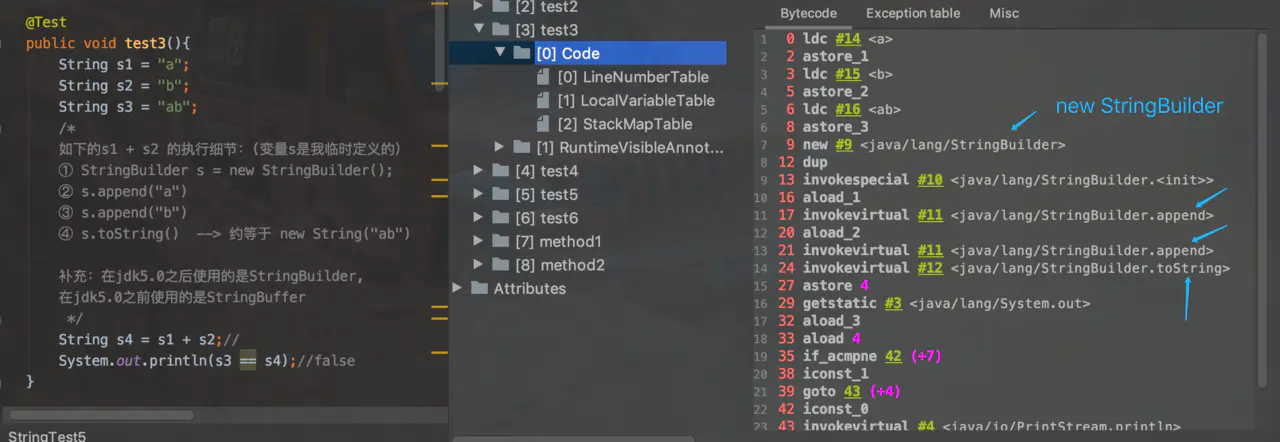 - 强调一下,toString()的隐式调用(只是隐含在字节码中StringBuilder拼接new String("a") + new String("b")之后调用),表明其属于变量的拼接,结果ab存储在堆区