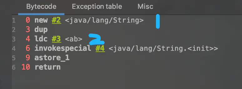 - 另一个对象是:字符串常量池中的对象"ab"。 字节码指令:ldc