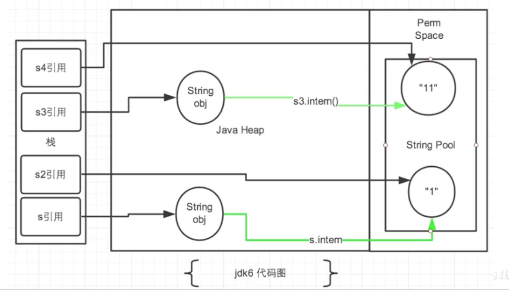 String s3 = new String("1") + new String("1");//s3变量记录的地址为堆中11,此时字符串常量池当中并不存在11//在字符串常量池中生成"11"。如何理解:jdk6:创建了一个新的对象"11",也就有新的地址。