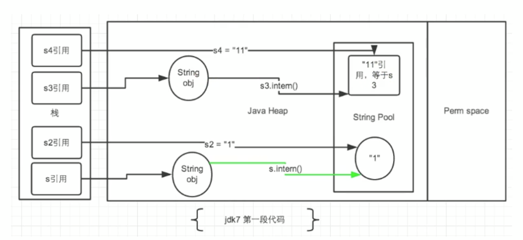 s.intern();//调用此方法之前,字符串常量池中已经存在了"1".即此方法可理解为无效