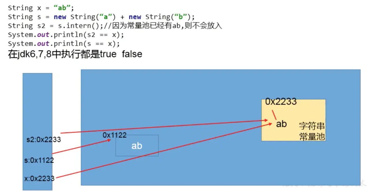 String s2 = s.intern();//jdk6中:在串池中创建一个字符串"ab"