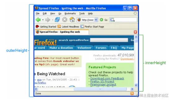 - Window.outerHeight: 获取整个浏览器窗口的高度,包括侧边栏、窗口镶边和窗口调正边框。