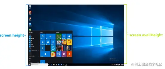 - screen.availWidth: 屏幕的可用宽度,不包括任务栏(如果任务栏在侧边)
