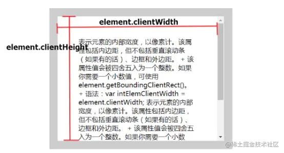 - element.clientWidth: 元素的内部宽度,包括内边距,但不包括垂直滚动条、边框和外边距。