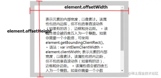 - element.offsetWidth: 元素的边框、水平线上的内边距、竖直方向滚动条、以及内容的宽度的值(不包括外边距)