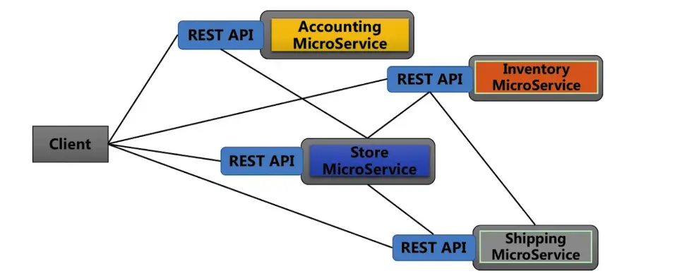 服务之间直接调用,每个微服务都开放Rest API,并调用其他微服务的接口