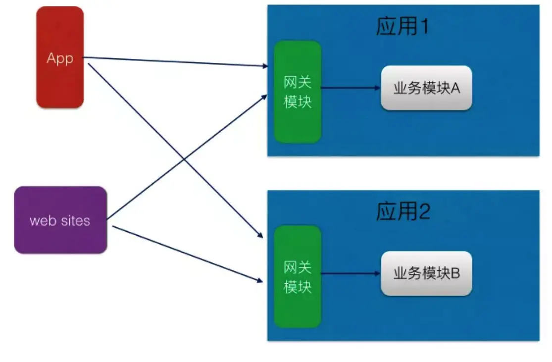 单体应用中,网关模块和应用部署到同一JVM进程,当外部移动设备或者web站点访问单体应用的功能时,请求是先被应用的网关模块拦截,网关模块对请求进行鉴权、限流等动作后在把具体的请求转发到当前应用对应的模块处理。