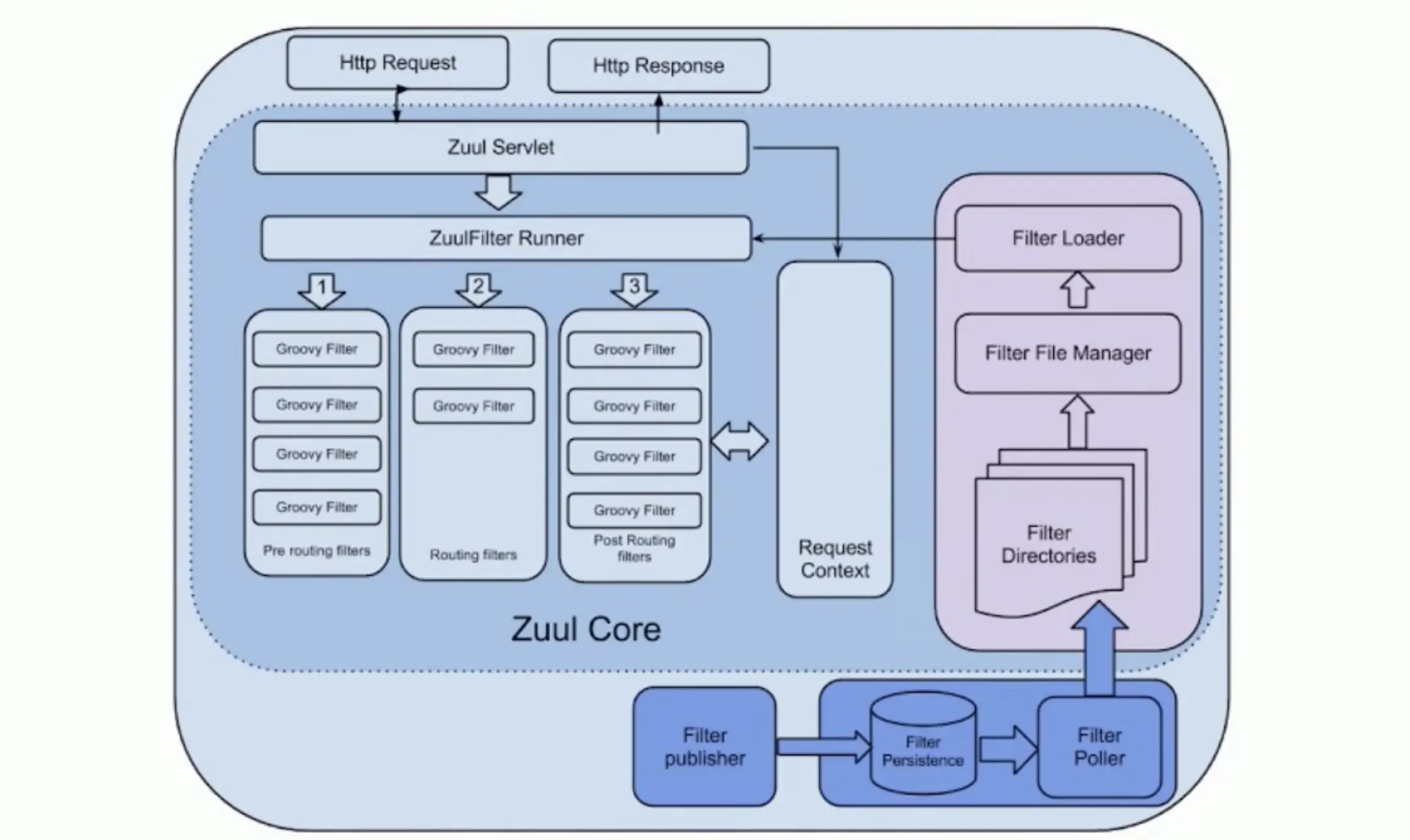 虽然Zuul 支持任何可以在jvm上跑的语言,但是目前zuul的过滤器只能使用Groovy脚本来编写。编写好的过滤器脚本一般放在zuul服务器的固定目录,zuul服务器会开启一个线程定时去轮询被修改或者新增的过滤器,然后动态进行编译,加载到内存,然后等后续有请求进来,新增或者修改后的过滤器就会生效了。