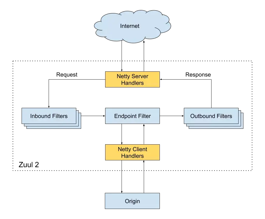 zuul2.0使用netty server作为网关监听服务器监听客户端发来的请求,然后把请求转发到前置过滤器(inbound filters)进行处理,处理完毕后在把请求使用netty client代理到具体的后端服务器进行处理,处理完毕后在把结果交给后者过滤器(outbound filters)进行处理,然后把处理结果通过nettyServer写回客户端。