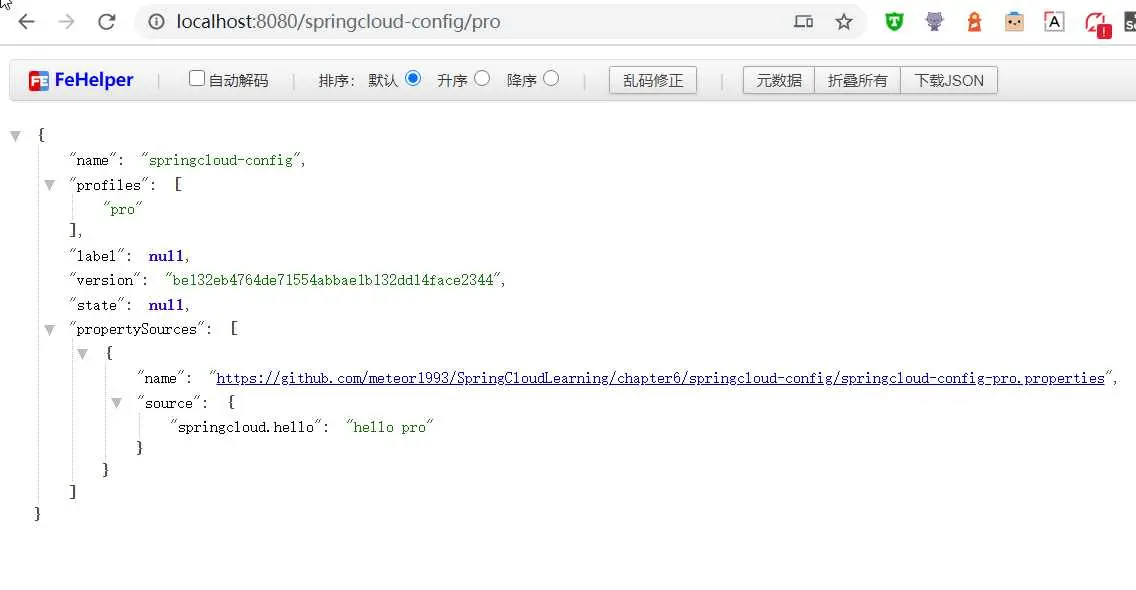 访问连接 http://localhost:8080/springcloud-config/pro 即可看到相关的配置信息