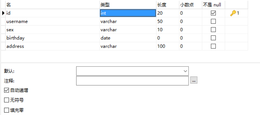 这里我们就不写脚本创建了,创建完成后,再向其中插入几条数据即可。 user 表字段如下: