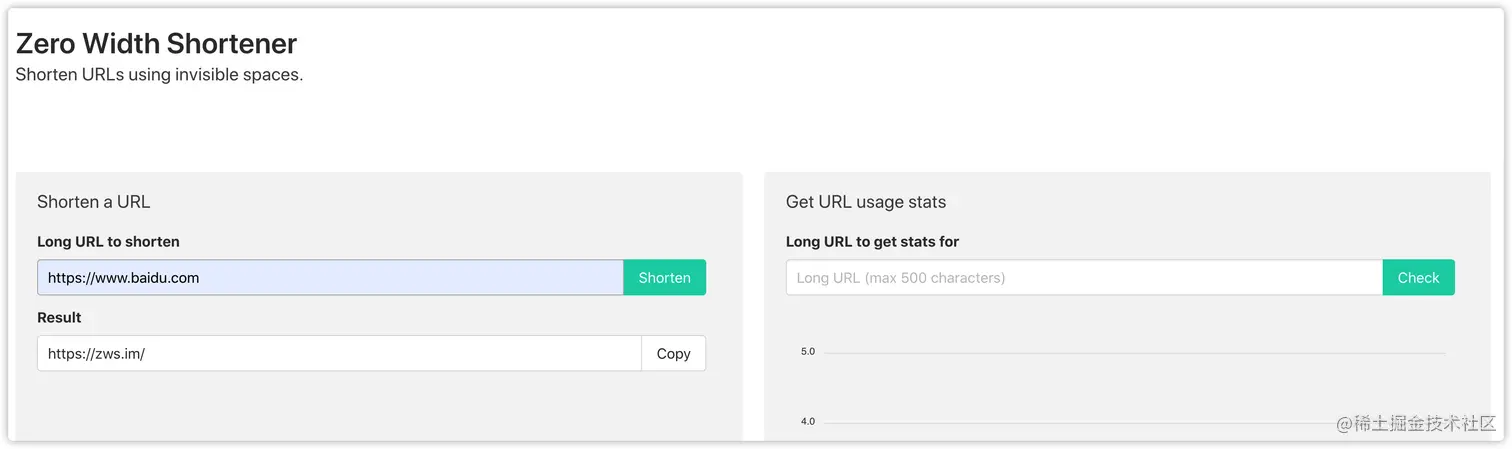 然而我们可以利用零宽字符也可以实现短网址的效果,,比如下面这个网站,就可以生成这类短网址。