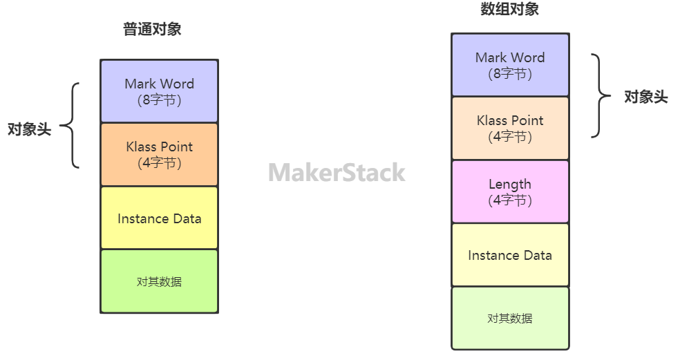**白话版:**对象头中包含又两个字段,Mark Word主要存储改对象的锁信息,GC信息等等(锁升级的实现)。而其中的Klass Point代表的是一个类指针,它指向了方法区中类的定义和结构信息。而Instance Data代表的就是类的成员变量。在我们刚刚学习Java基础的时候,都听过老师讲过,对象的非静态成员属性都会被存放在堆中,这个就是对象的Instance Data。相对于对象而言,数组额外添加了一个数组长度的属性