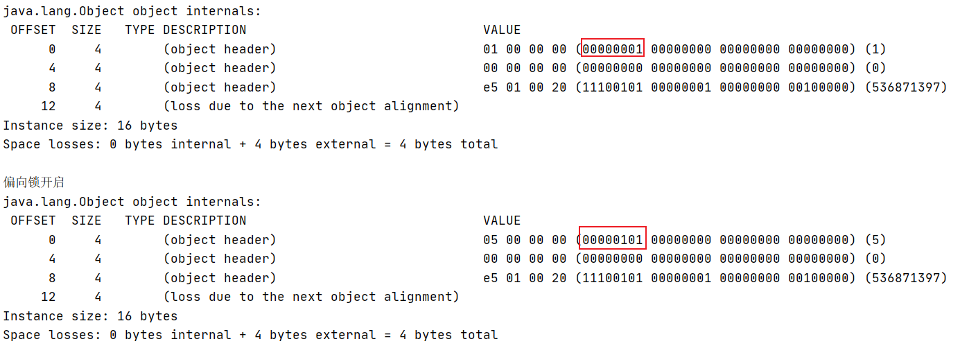 System.out.println(ClassLayout.parseInstance(o).toPrintable());//五秒以后偏向锁开启