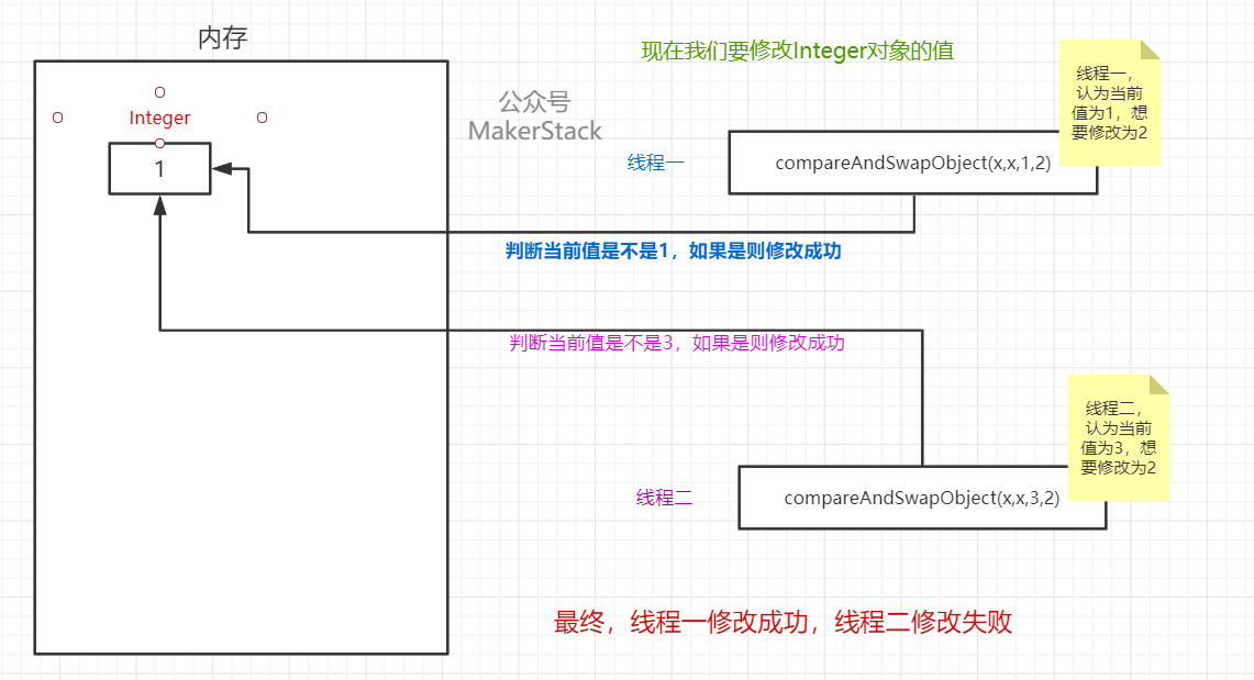 「首先,我们需要将当前线程认为的值传入,然后将想要修改的值传入。如果此时内存中的值和我们的期望值相等,进行修改,否则修改失败。这样是不是解决了一个多线程修改的问题,而且它没有使用到操作系统提供的锁。」