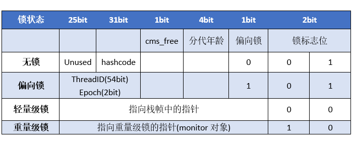 上图就是对象头在内存中的表现(64位),JVM通过对对象头中的锁标志位和偏向锁位的修改实现“无锁”。