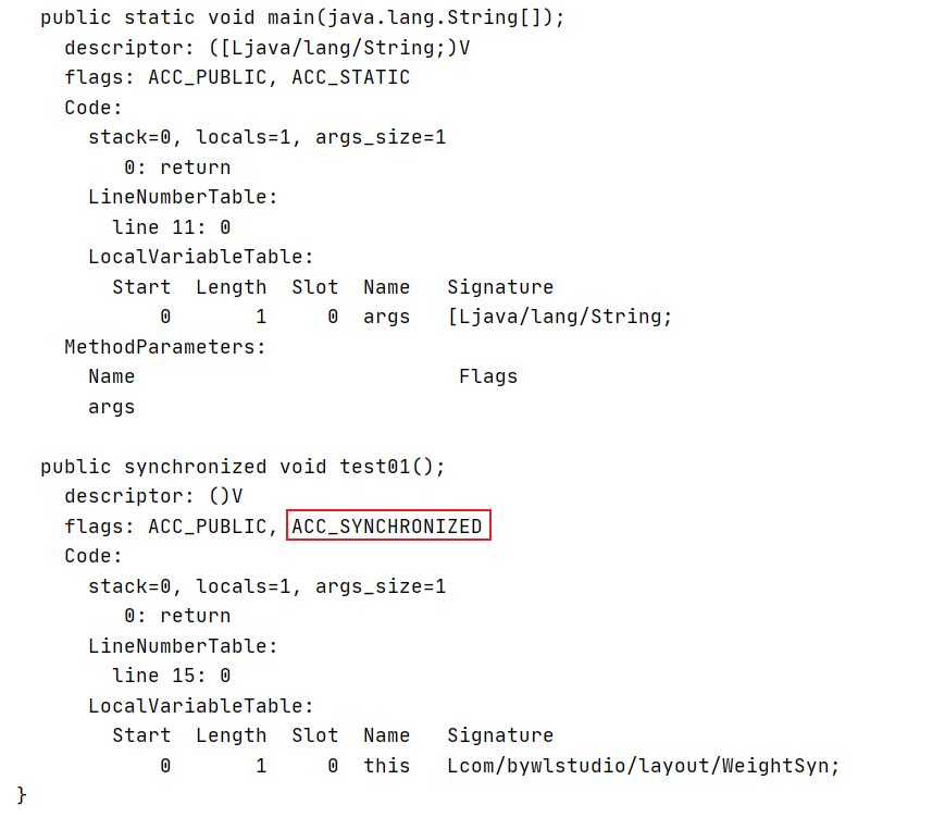 我们可以看到,同步方法增加了一个ACC_SYNCHRONIZED标志,它会在同步方法执行之前调用monitorenter,结束以后调用monitorexit指令。