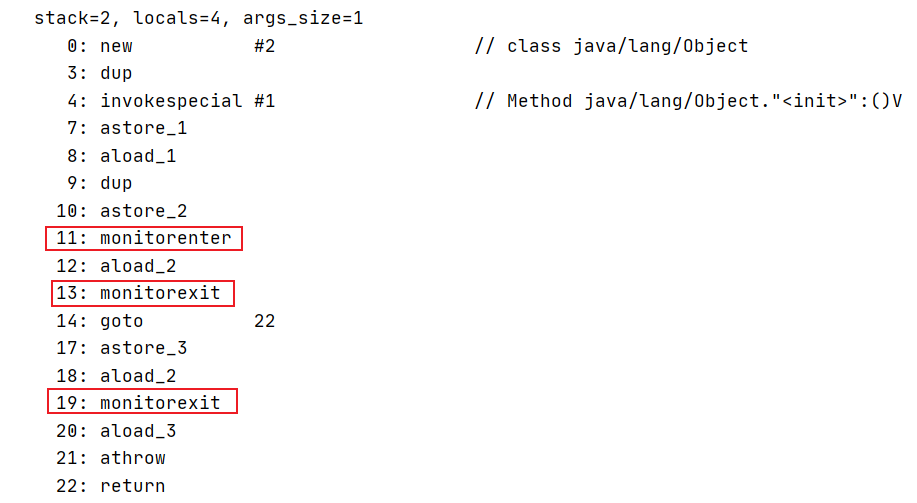 很好理解,当在synchronized块中出现了异常以后,不能当前线程一直拿着锁不让其他线程使用吧。所以出现了两个monitorexit