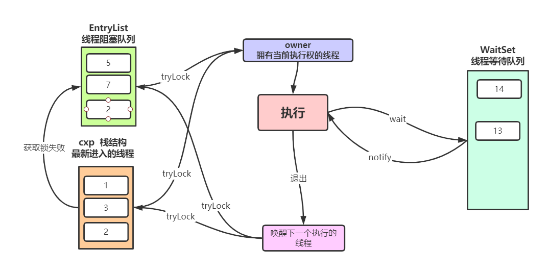 _cxp栈中,尝试获取锁,如果当前线程获得锁就执行代码,如果没有获取到锁则添加到EntryList阻塞队列中 - 如果在执行的过程的当前线程被挂起(