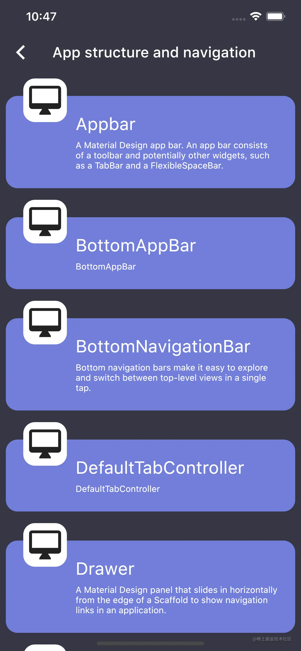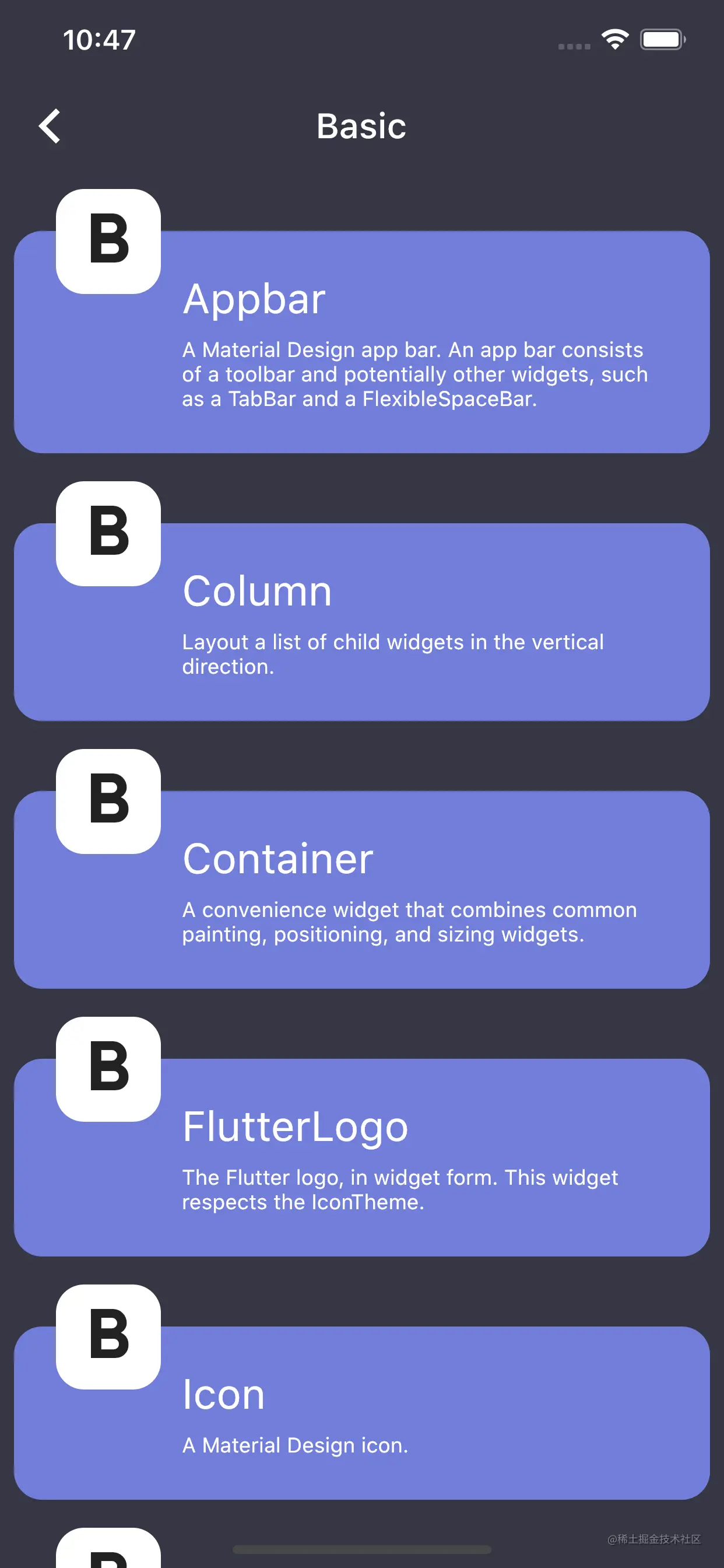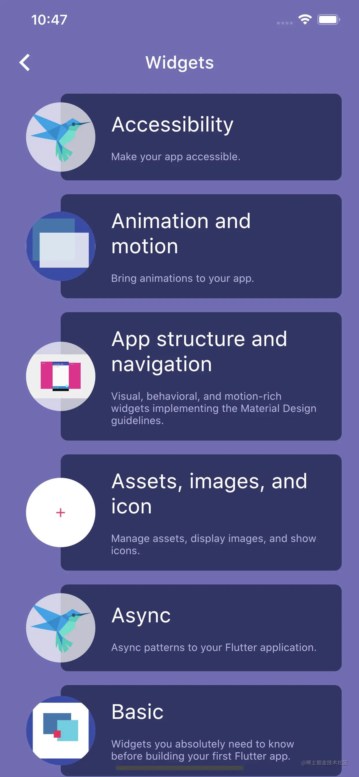 Widgets部分的设计思路是为了演示Flutter中茫茫多的Widget的具体使用场景和功能,虽然只使用Flutter提供的一些基本Widget,已经可以实现大部分的界面、功能开发,但是,了解更多的Widget,可以让开发者的开发思路更广,使用更加合适的Widget来完成合适的开发场景。